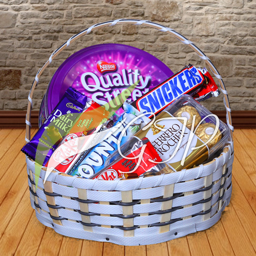 Basket Of Choco is perfectly arrange for one you care back home in Pakistan.Quality Street 240 gsm,16 Pcs Ferrero Rocher,3 Bar Sincker,3 Cadbury Dairy MILK Bars,3 Bounty Bar,3 Kit kat Chocolate.