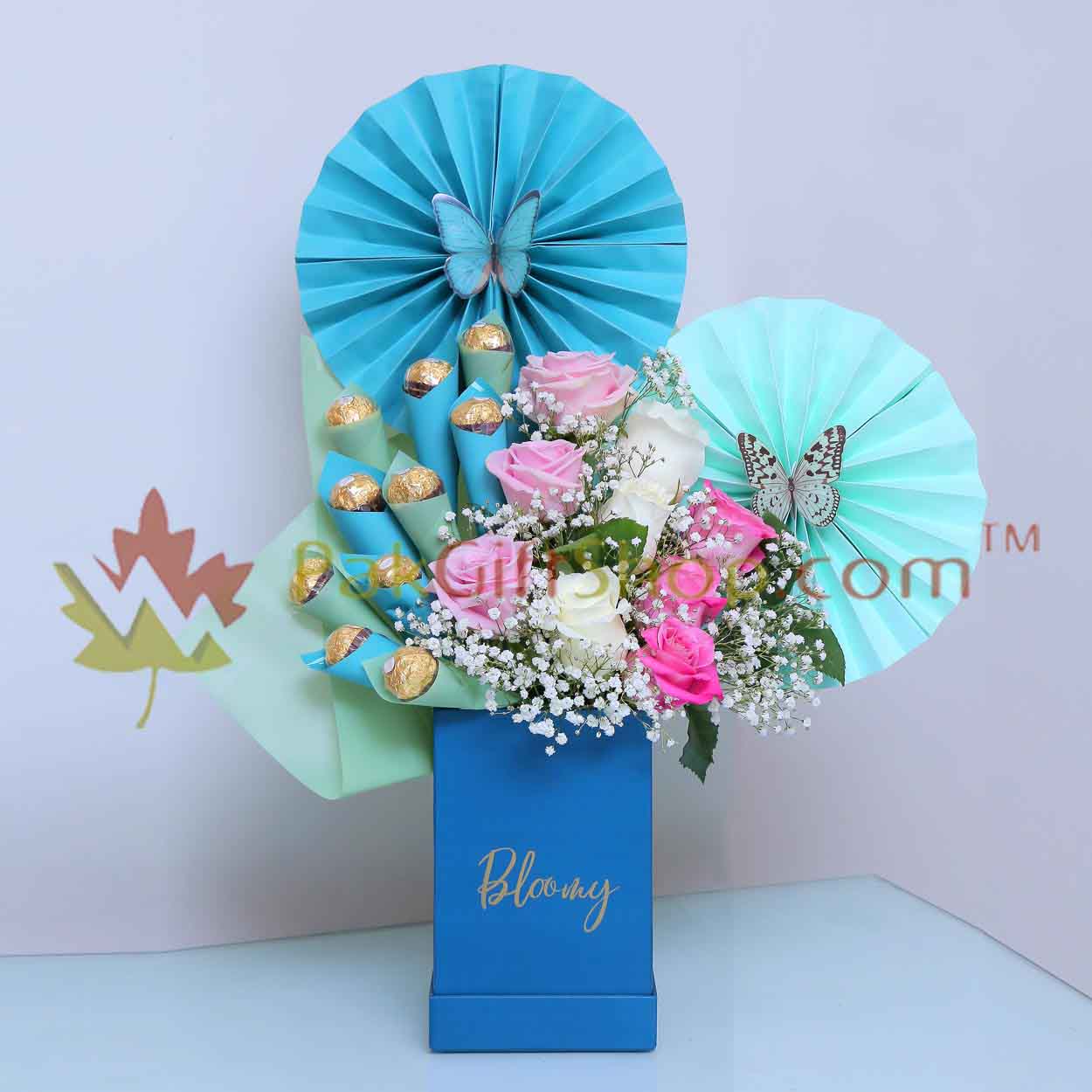 Every love story deserves that magical ever after, in a land where love lasts forever, and the skies are nothing but bright blue. Bring her that very feeling of enchantment, and true love with a bouquet just as magical as her! Our Blue Bird – with kisses of soft pink & whites roses, Ferrero chocolates, Paper hand work and beautiful butterfly all arrange in Bloomy Box, is an arrangement sure to make all her dreams come true.
