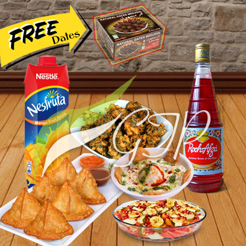 1 Kg Pakoray, 6 pcs Potato Samosay, 2 Plates Fruit Chat,1/2 Kg Dahi Baray, 1 Nestle Juice, 1 Rooh Afza.